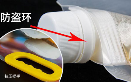 4、防盜環設計,灌裝結束后,順時針方向擰緊蓋子,防盜圈即可扣住,逆時針打開防盜環脫落。